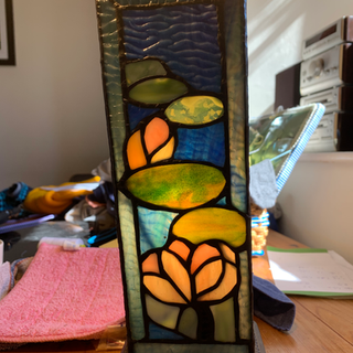 To make this I created an out line drawing based on the pattern on the lamp base. I then created. 4 panels from black card stock to fit each of the sides of the shade. I cut the shapes out of the black to give the lead effect of stained glass, and then used 50gsm white paper to cover the back. 50gsm is translucent enough to let the light shine through but substantial enough to take the addition of colour. I used my alcohol markers to colour in each section to co ordinate with the colours of the base, and I was super pleased with the outcome.